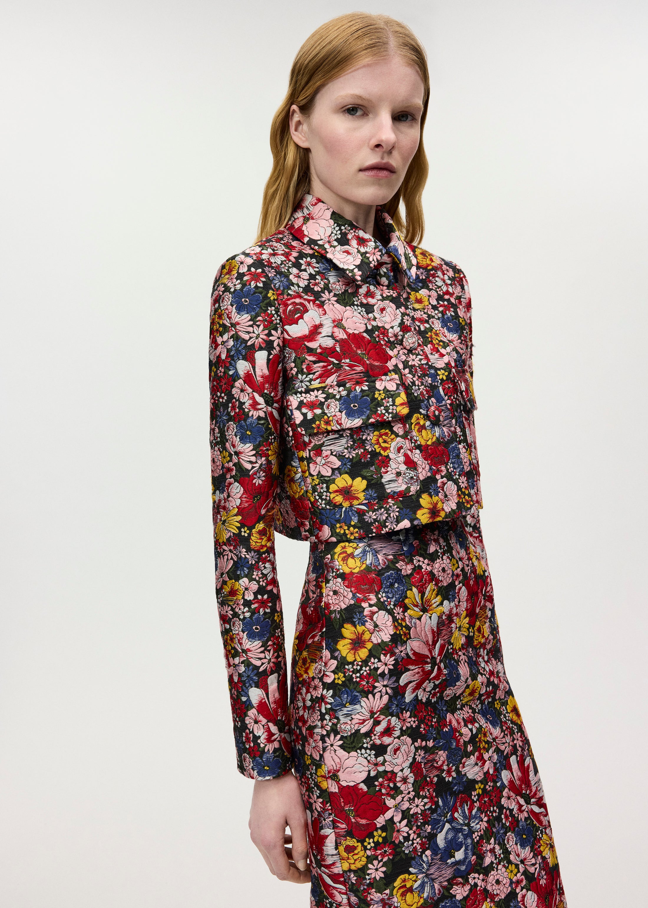 A bold statement piece, the Cecil Jacket is constructed in a cropped silhouette from luxurious hana brocade. Tailored with shoulder pads for added structure, it features patch pockets and a covered button closure. Pair it with the matching Blair Skirt.