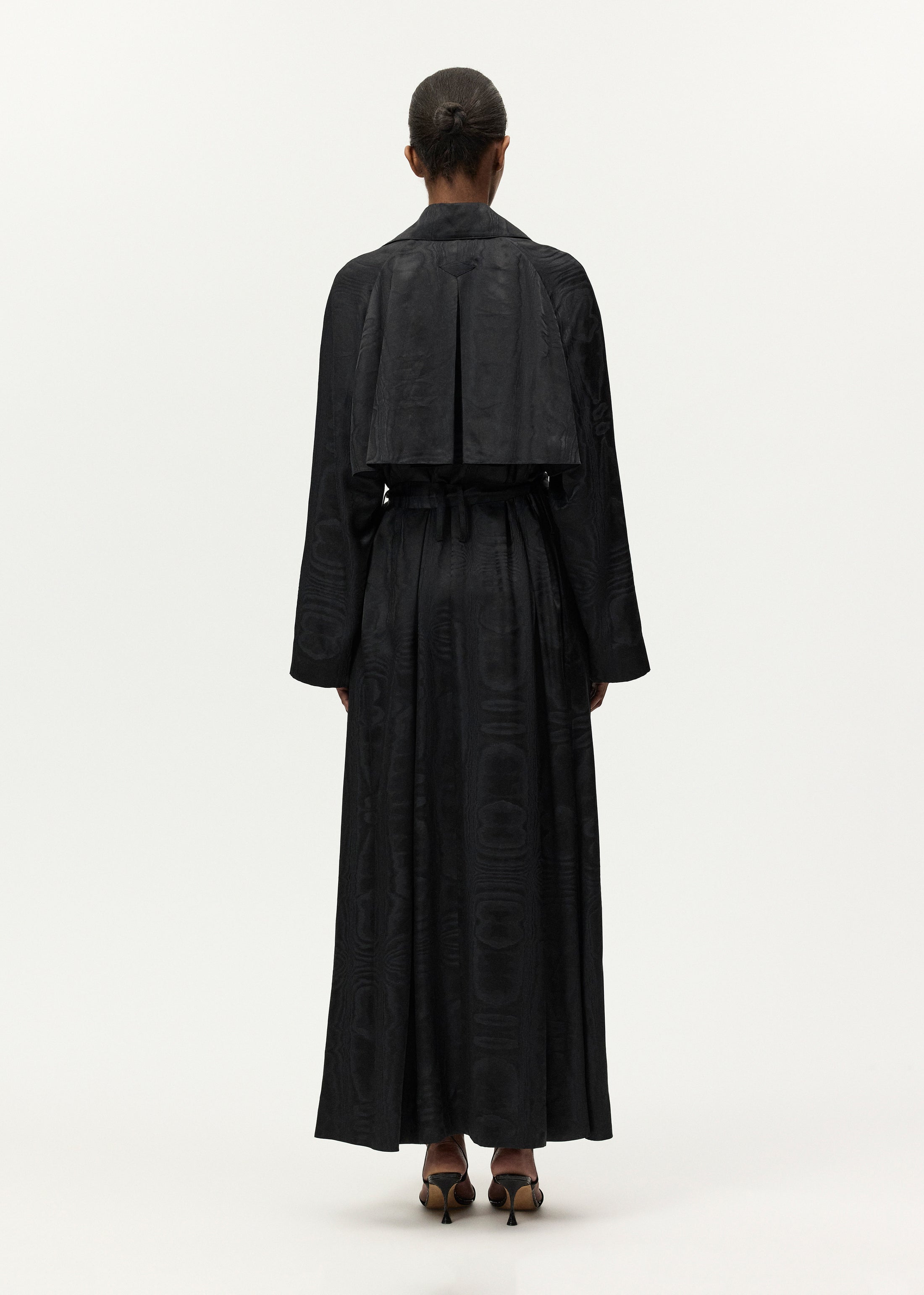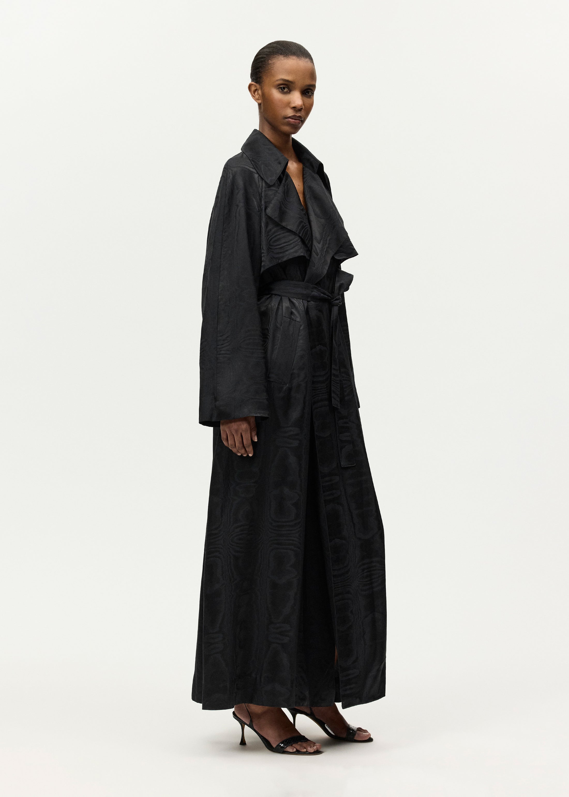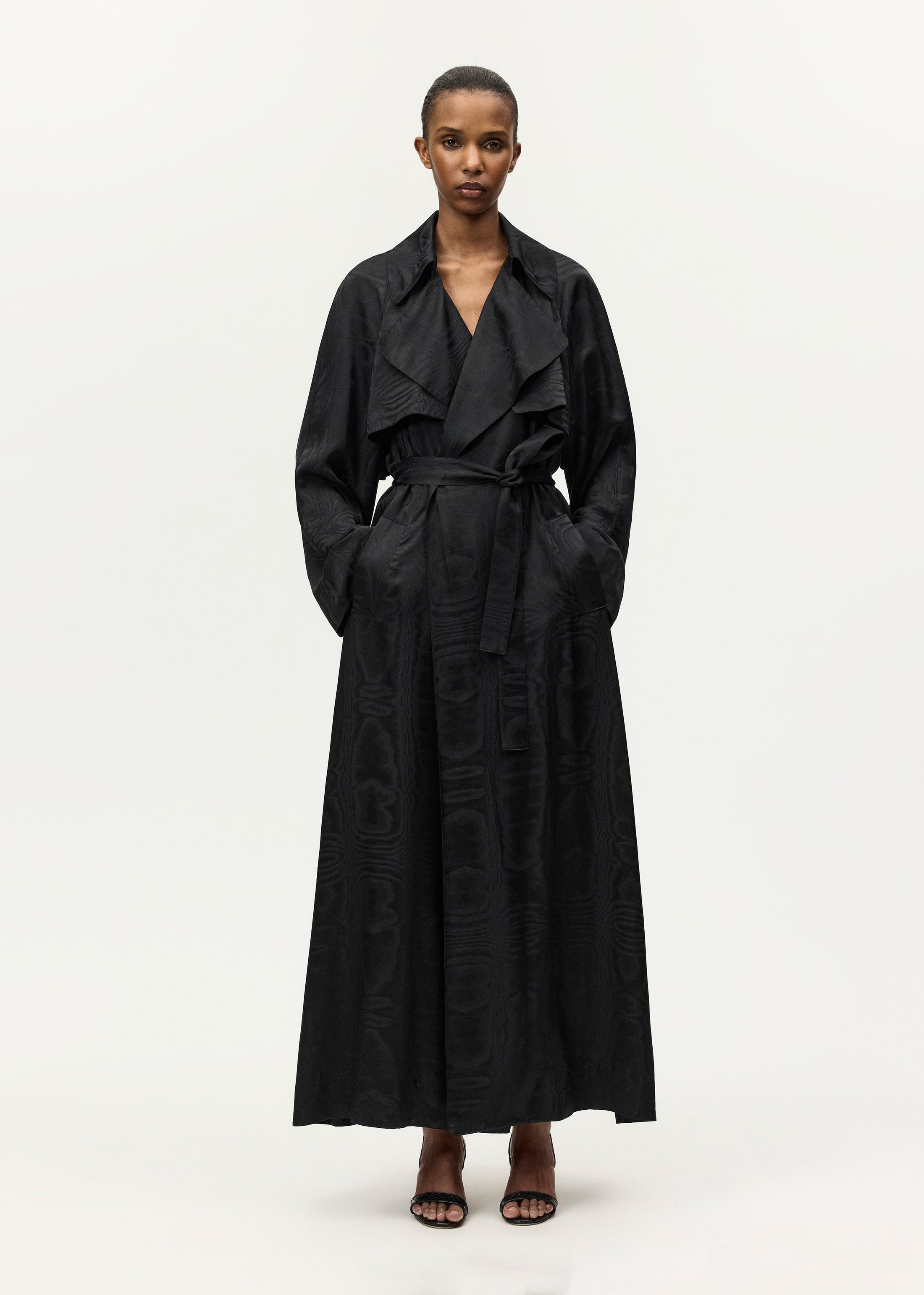 A sweeping statement piece, the Gareth Trench is constructed from bespoke yakisugi jacquard. Designed in a fluid cut that drapes elegantly on the body, this lightweight piece is finished with a coordinating belt to cinch the waist.
