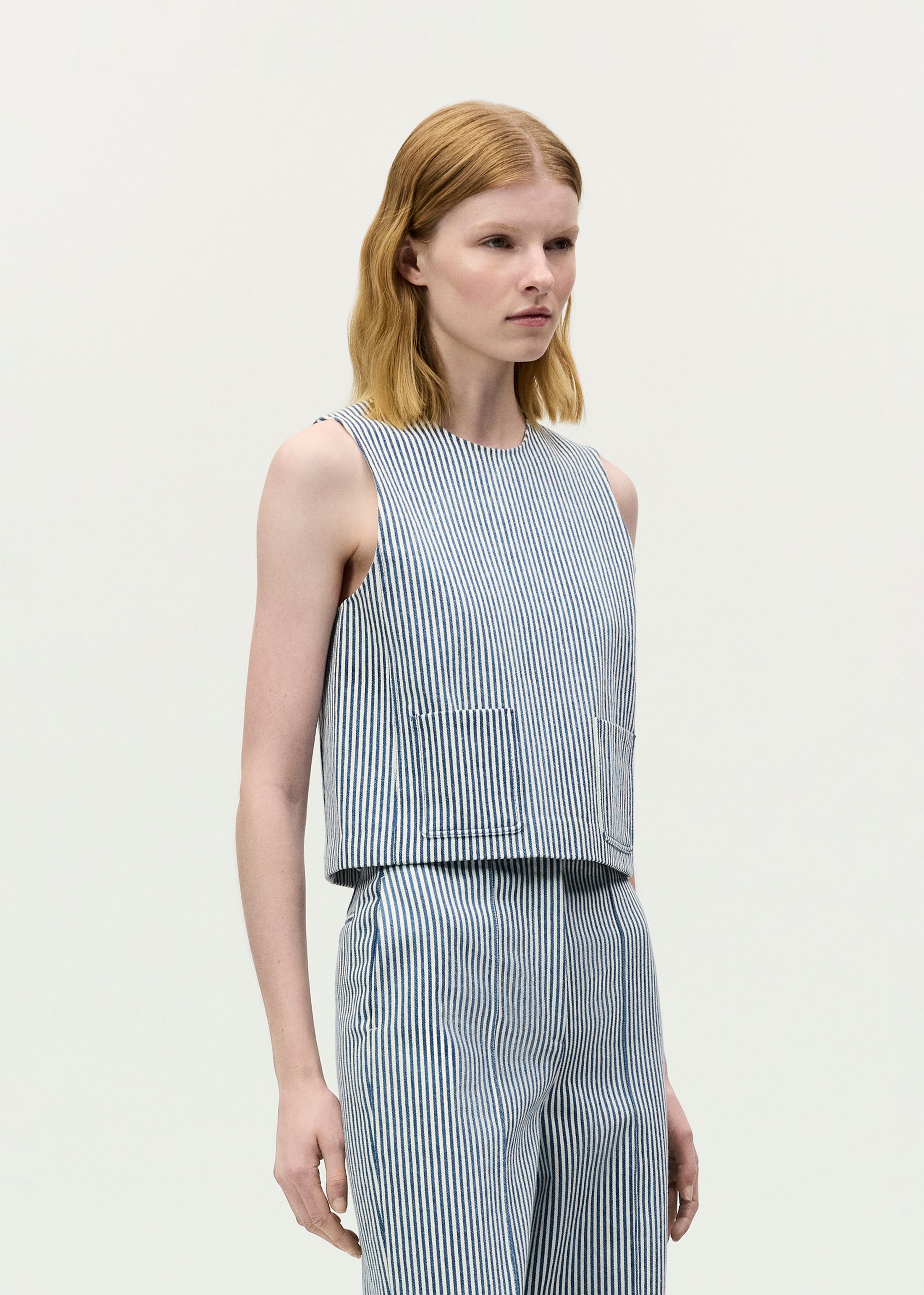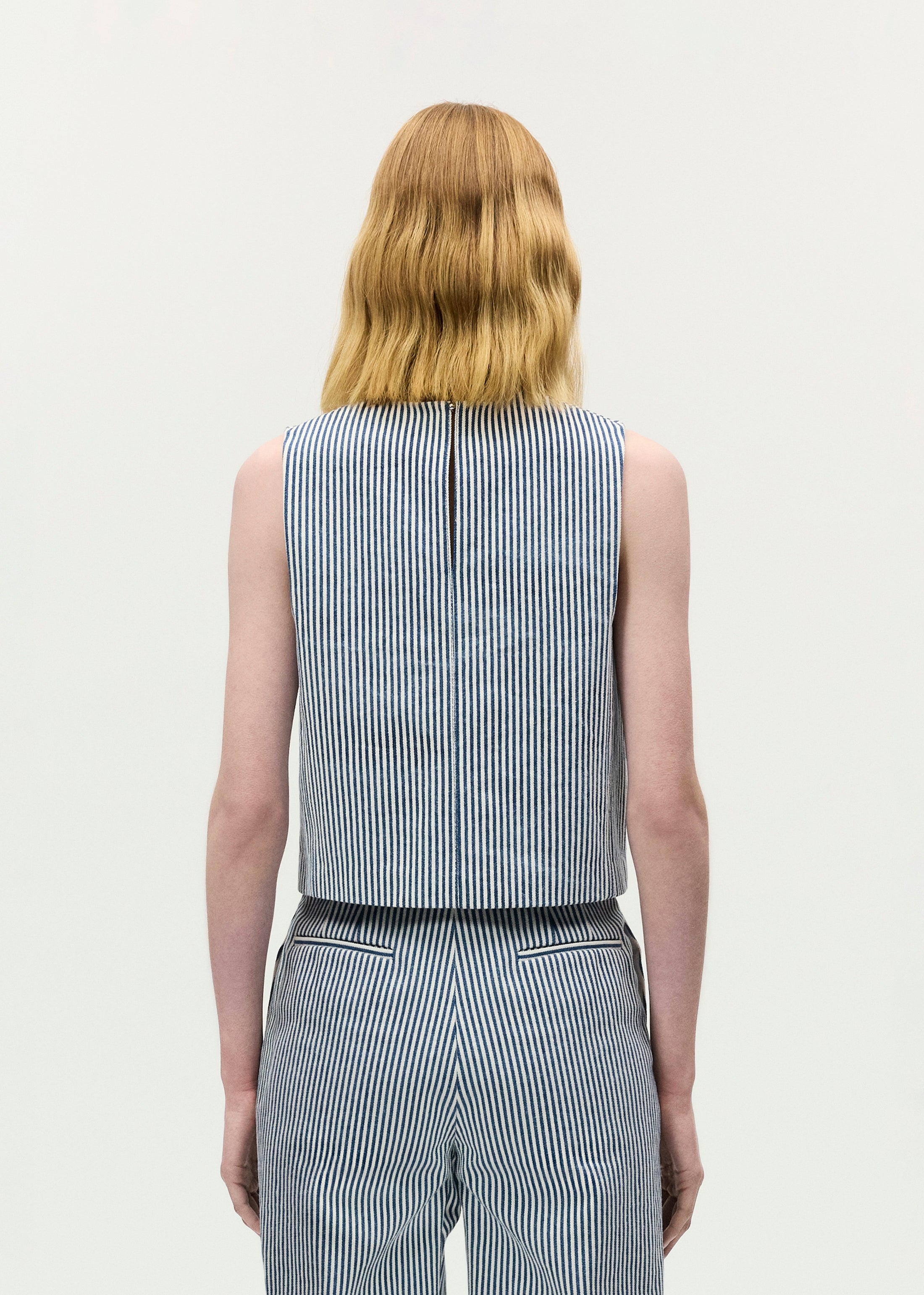 A sleeveless silhouette crafted from railroad stripe denim, the Ludlow Top features a cropped length and patch pockets. Pair it with the coordinating Deeda Pant for a cohesive look.