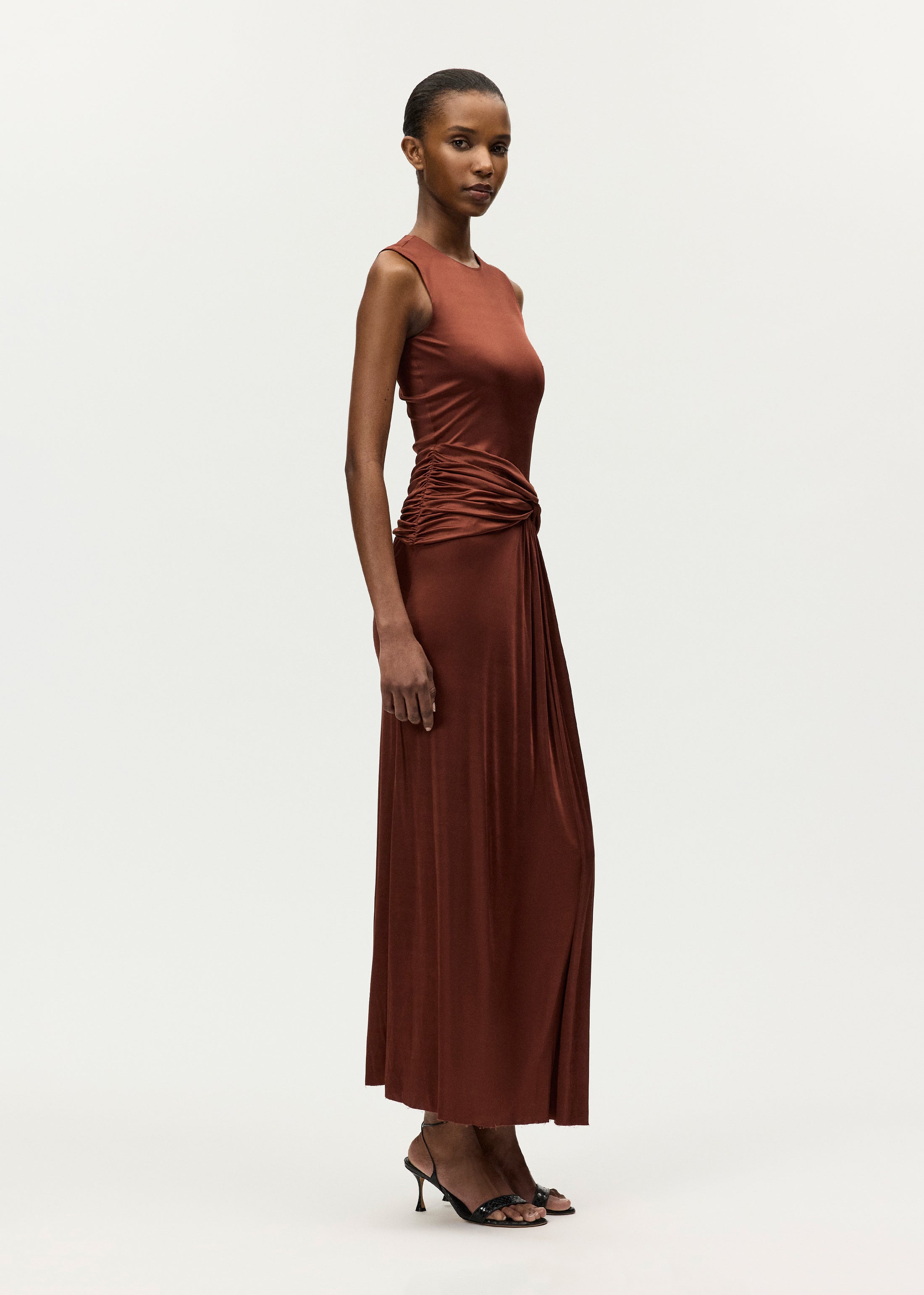 Constructed from lustrous viscose, the Talitha Dress is cut in an understated sleeveless silhouette. Hand draping accents the waist with pleating and dimension.